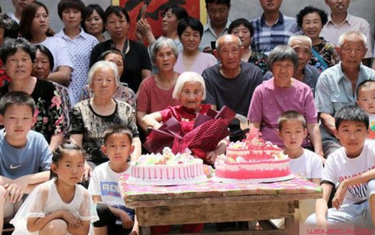 据介绍,老人出生于1916年,现在家里一共有168口人,而最小的玄孙是9个月大,和老人年龄差有一个世纪。
